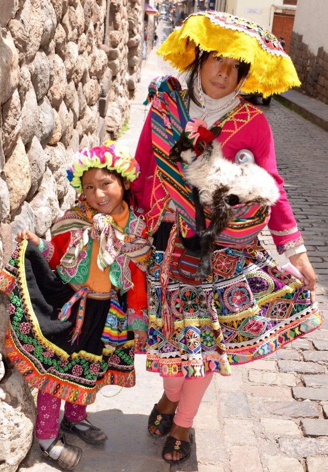 Another great day exploring Cusco (I’ve landed on this spelling). It has a small town feel, with narrow, winding streets filled with folks trying to sell me something -tours, trinkets, hats, whatever. My favorites were the ultra-touristy gals dressed up and carting their lamas through the streets, asking tourists to pay a quarter for a photo. What can I say, I couldn’t help myself. And yes, the lamas are that cute!